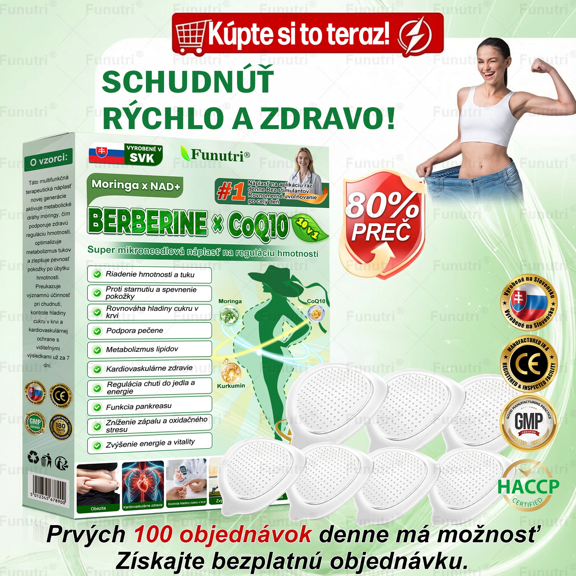 𝐅𝐮𝐧𝐮𝐭𝐫𝐢® 𝐌𝐨𝐫𝐢𝐧𝐠𝐚 × 𝐍𝐀𝐃+ × 𝐁𝐞𝐫𝐛𝐞𝐫𝐢𝐧𝐞 × 𝐂𝐨𝐐𝟏𝟎 𝐒𝐮𝐩𝐞𝐫 𝐧á𝐩𝐥𝐚𝐬ť 𝐬 𝐦𝐢𝐤𝐫𝐨𝐢𝐡𝐥𝐢č𝐤𝐚𝐦𝐢 je vyvinutá na základe 20+ rokov výskumu za účasti viac než 30 odborníkov a je určený pre všetkých dospelých a všetky typy postáv. Je poháňaný Moringou, ktorá podporuje metabolizmus a energiu, NAD+, ktoré prispieva k bunkovej energii a anti-aging účinkom, Berberínom, ktorý pomáha regulovať hladinu cukru v krvi a zlepšovať metabolizmus tukov, a CoQ10, ktorý podporuje tvorbu energie a celkové kardiovaskulárne zdravie. Táto nano mikroneedlová náplasť dodáva aktívne látky cez pokožku na podporu zdravej rovnováhy cukru v krvi, kontroly chuti do jedla a metabolizmu tukov pre postupné a udržateľné riadenie hmotnosti – bez tabliet alebo injekcií. Obohatená o Collagen Peptides pomáha udržiavať pevnosť pokožky počas chudnutia a zároveň podporuje trávenie, zdravie čriev a žien, energetickú hladinu, zníženie únavy a celkovú metabolickú rovnováhu. Vyrábaná v GMP-certifikovaných zariadeniach podľa noriem Slovenska a EÚ ponúka bezpečné, vedecky podložené a bezihlové riešenie pre efektívnu kontrolu hmotnosti a každodennú pohodu.
